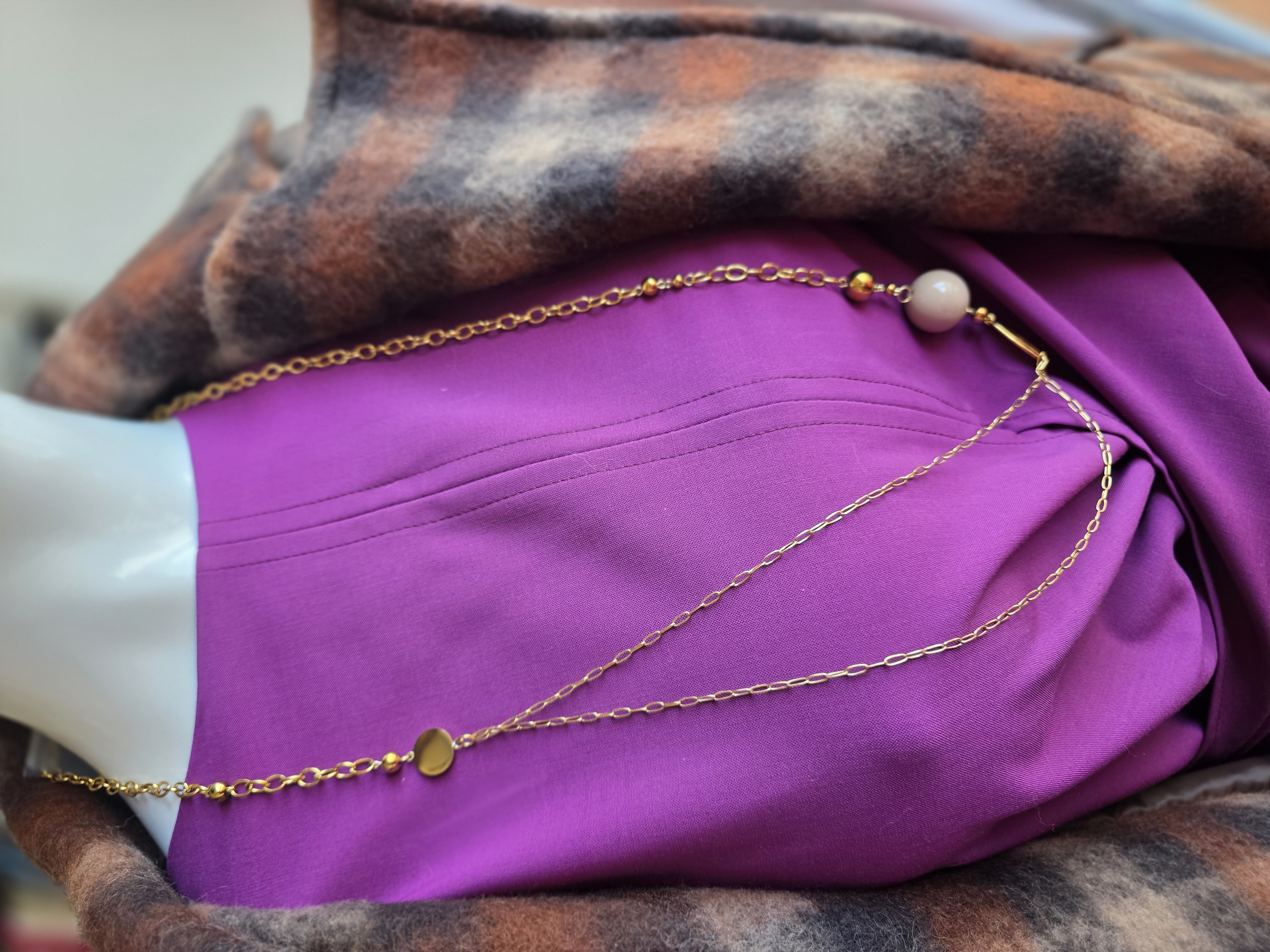 Výraznejší dlhý náhrdelník so zlatistými článkami a elegantným detailom v spodnej časti. Kombinácia hladkých kovových prvkov a jemných guľôčok vytvára moderný, no stále ženský dojem. Náhrdelník, ktorý si všimnete – ale stále zostáva vkusný a nadčasový.