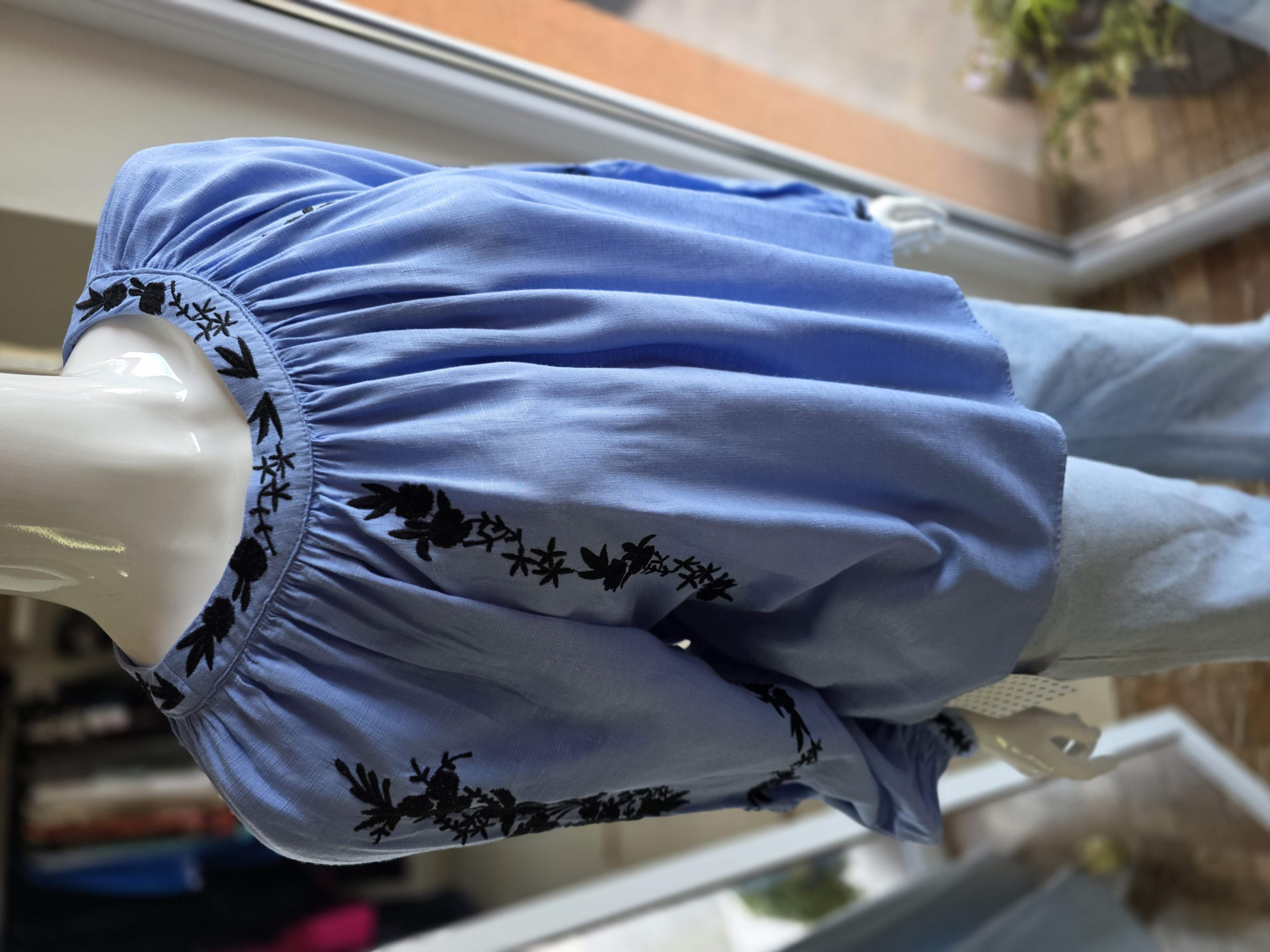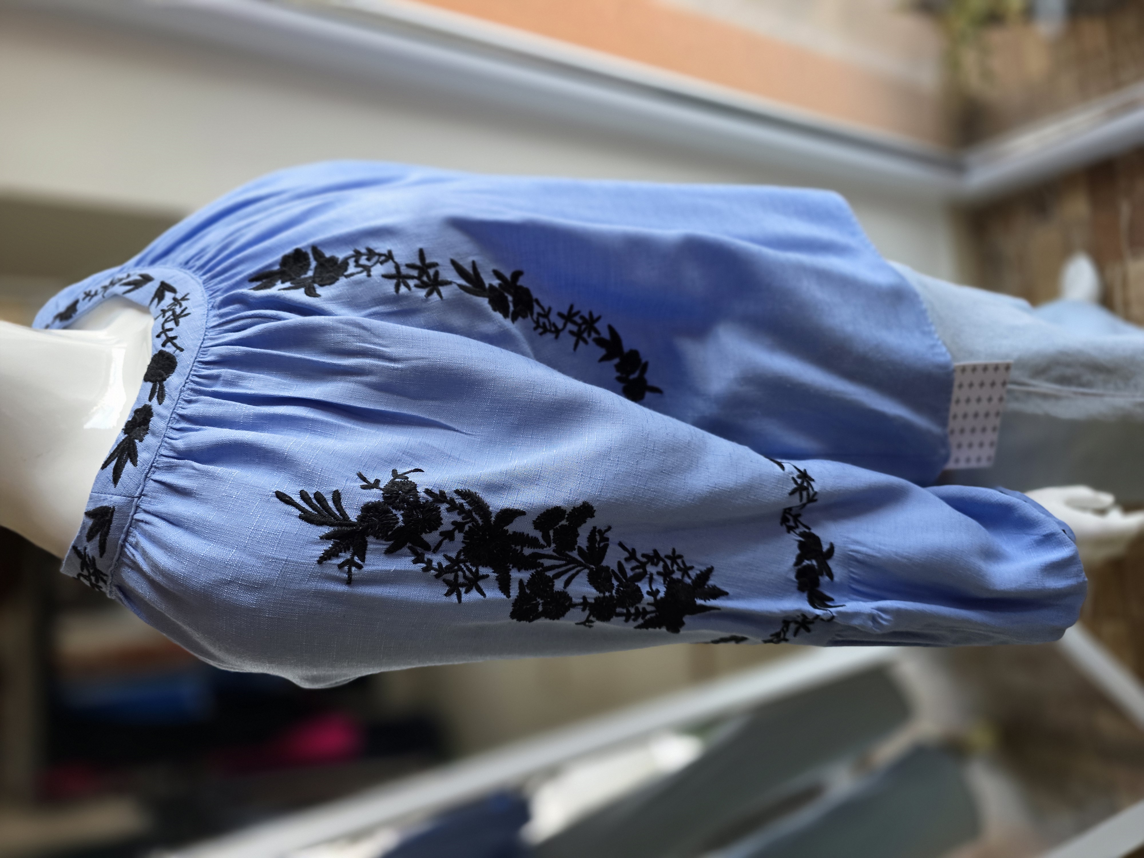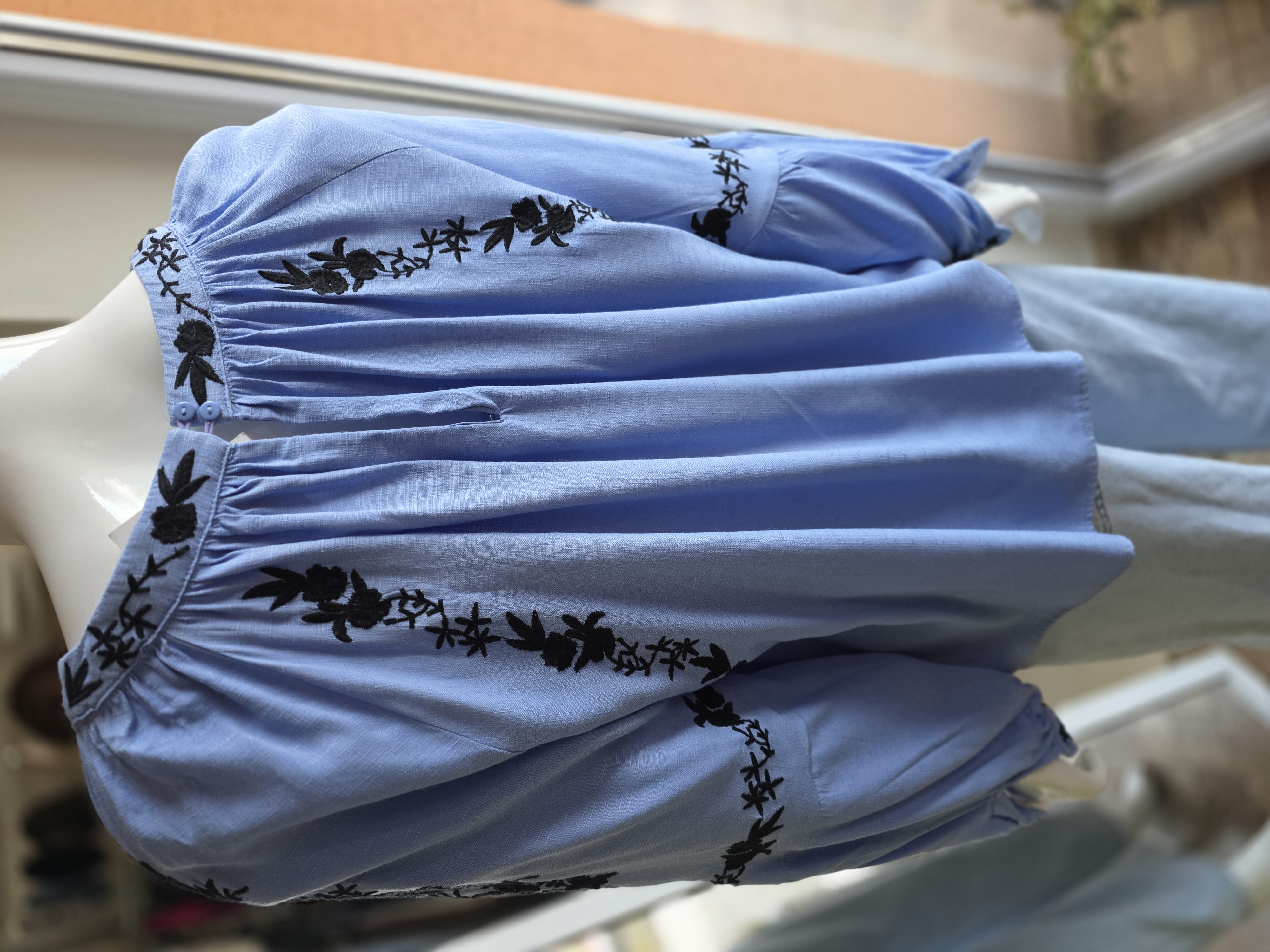 Popis: Vzdušná. Jemná. Trochu poetická. Tmavá výšivka okolo výstrihu a na rukávoch jej dáva čitateľný charakter. Padá voľne, lichotí postave a necháva ti priestor dýchať. K džínsom vytvorí nenútenú eleganciu. K nohaviciam a sukni pokojný ženský look. Je pre dni, keď chceš pôsobiť jemne.