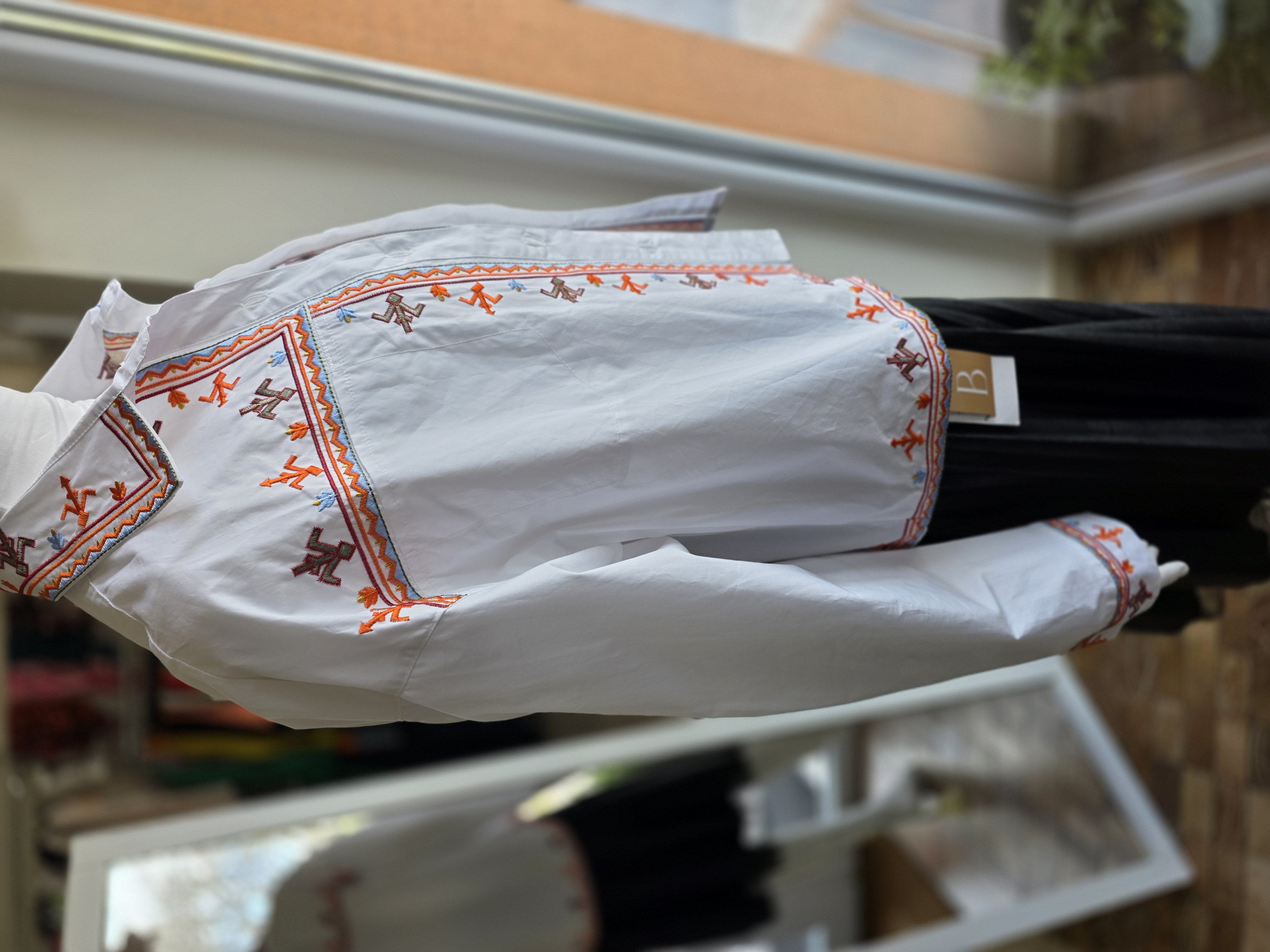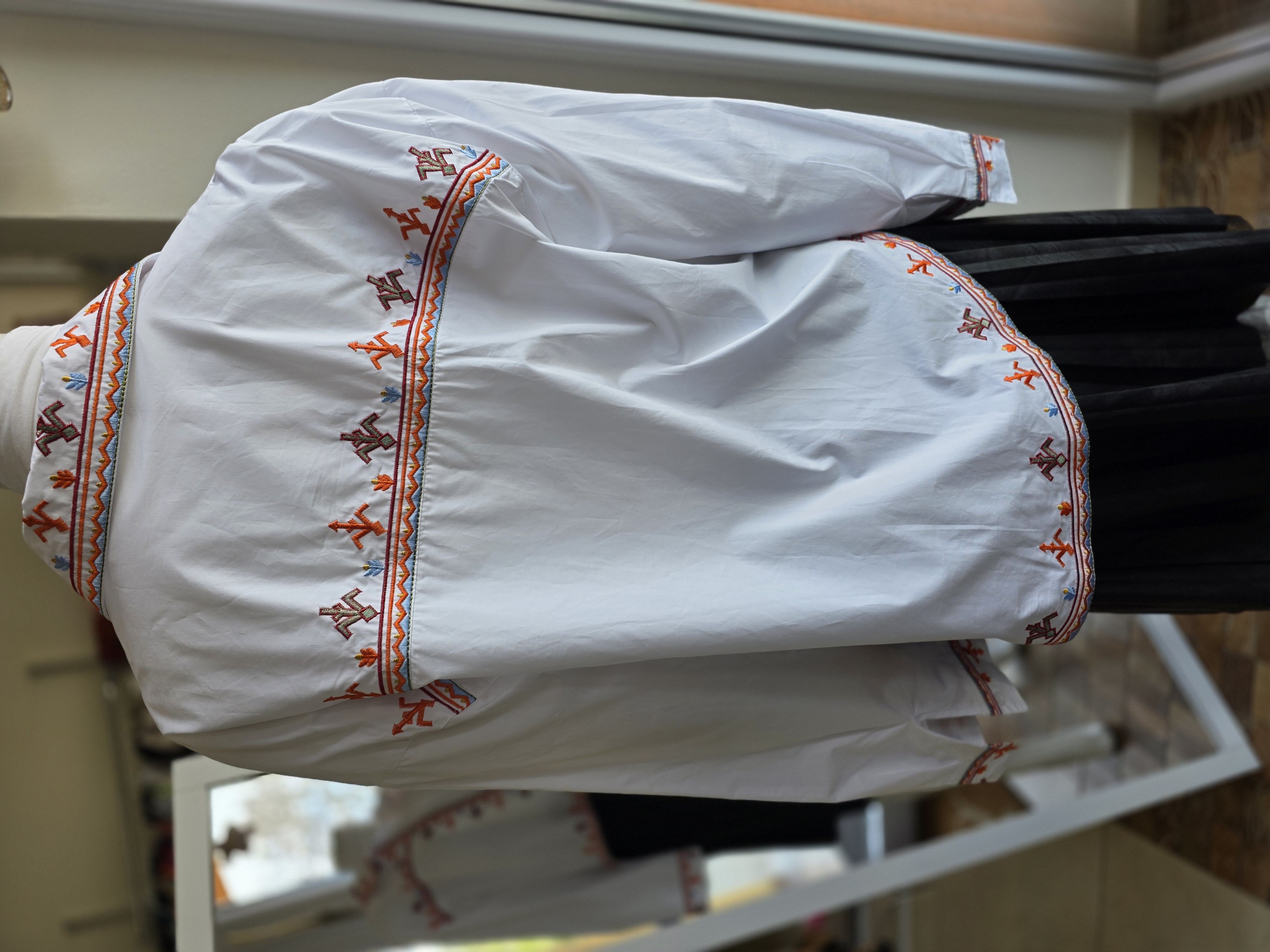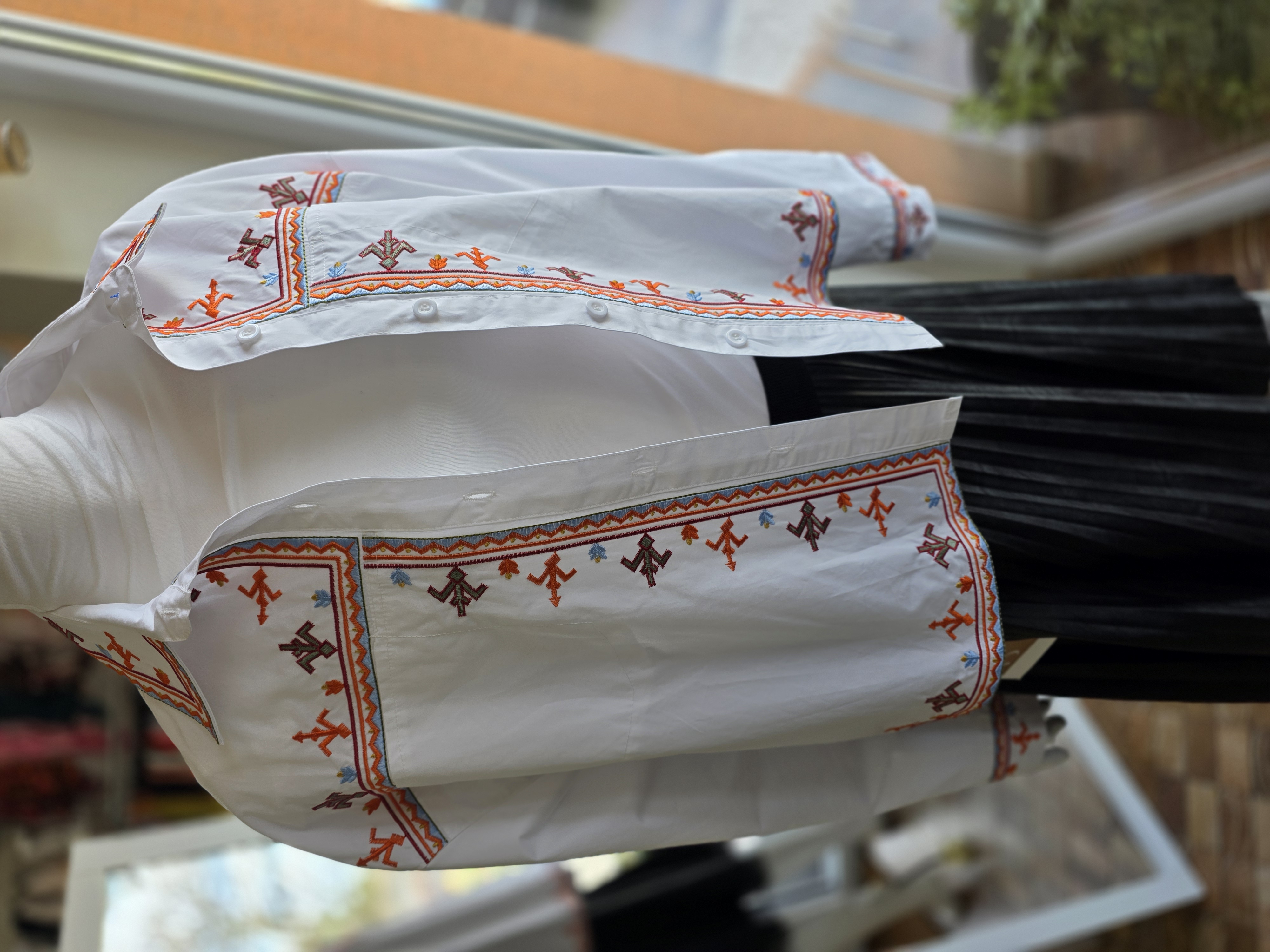 Popis: Originálny unikát. Niečo medzi tradíciou a modernou. Detailná výšivka robí z obyčajnej bielej košele výnimočný kúsok. Vďaka svojmu materiálu ju kľudne môžeš hodiť cez tielko a nosiť ako tenkú bundošku. K rifliam aj sukni – vždy budeš pôsobiť upravene, ale nie nudne. Vďaka strihu "padnuté ramená" ju môže mať od S-L. Rukávy si vyhrnieš a prispôsobíš.